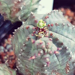 ユーフォルビア・スザンナエ(♀)✴️ 和名:瑠璃晃 流通名:ドラゴンボール スザンナエの女のコ達が3株花を咲かせてるのに男のコは誰もヤル気無し💦 バリダの男のコが凄まじく花粉を落としてるので受粉を試みてます。。。 果たして結実するかな⁉️🤔