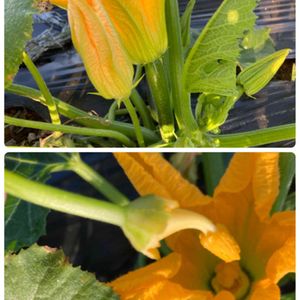 ズッキーニ ウリ科 雄花と雌花が並んで咲きました ⬆️雌花には実のような物が ⬇️受粉して実になります