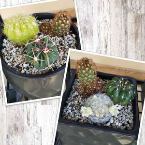 こんばんは😃🌃 今日もいいお天気で暖かかったです😊💕 2月に100均で購入したサボテン3鉢に、またまた100均で2鉢買い足して、全部一緒に寄せ植えにしようとしましたが、難しかったので2鉢に分けました😅💦 鉢ももちろん100均です😁🎶 3+2=5なのに全部で6つなのは、黄金司が2本入っていたからです(*´艸`*)♪ サボテン🌵とは相性が良くない疑惑があるので、ちゃんと育ってくれるかな〰️😅💦