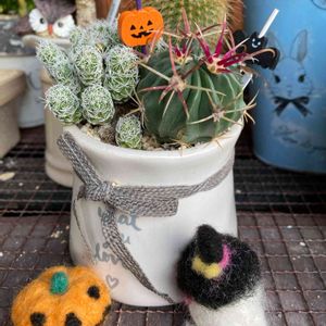 🎃HappyHalloween〜🎃 朝は雨曇りお昼からてお天気になって多肉事日和であれやこれやしてたら少し暑くなりました😅 ダイソー産の🌵さん寄せにハロウィンピック 色合いが好き〜💕 オバケさんのオケツで オケツの日 参加します🎶😃