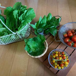今日の収穫♪ カゴいっぱいのサンチュ シソ、ベビーリーフ、バジル、ローズマリー、マイクロトマト、ミニトマト✨ いただきまーす😆😋
