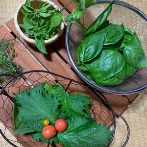 今日の収穫♪ バジル(3・4種類)、レモンバジル、スープセロリ、ディル、しそ、ミニトマト✨