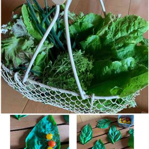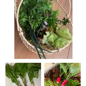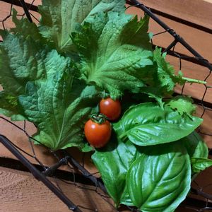 今日の収穫♪ みどりと赤がキレイ✨ シソ、ミニトマト、バジル、ベビーリーフ。