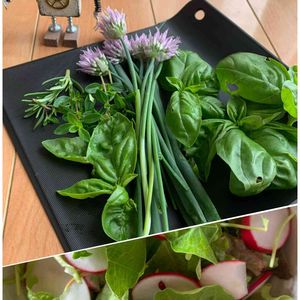 今日の収穫♪ サニーレタス、サンチュ、チャイブ、アフロバジル、バジル、ベビーリーフ、マイクロトマト赤と黄色✨ レタスは今日で最後です😢 お世話になりました🤣 バジルさん、普通種なのに、12センチもございました〜🤣 (虫食いだけど…💦)