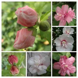 蕾祭りのつぼみが開花したところ第15弾、ムクゲです~ムクゲは好きなお花で、数種類育てています。地植えにしていたら育ちすぎて、隣家に迷惑がかかるほどになってしまったため、伐採し、枝を挿し木して鉢で育てています。挿し木の下手なσ(^▽^;)でも簡単に出来ましたから、ほんとに増やしやすい植物ですね。桃紫のは昔お花屋さんにおまけでもらったもので、品種名はわかりません。右の淡いピンクに赤の入ったのはピンクデライト、下の同様の色のは、ストロベリースムージーです。