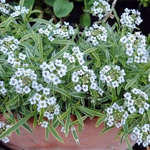 今日のお花、アリッサムです。スーパーアリッサム・フロスティーナイト、斑入りの葉がきれいで、耐暑性の強い栄養系のアリッサムです。スーパーアリッサム・スノープリンセスに比べると、若干弱いようですが、種から育てる品種よりは強い気がします。