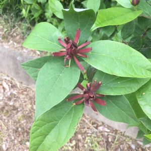 本日2枚目📷 お出かけ先にて。 細目の木(高さは2mほど)に 綺麗な💠花がたくさん咲いていました。 名前が解る方いらっしゃいますか❔ 追記✏️ 雲珠さんのpicで クロバナロウバイの カリカンサスと解りました。 クロバナロウバイと夏ロウバイの交配種💠だそうです❗ ありがとうございます🙇