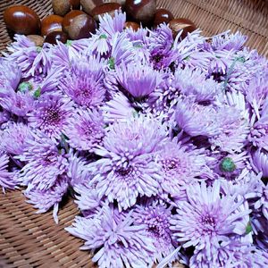 『もって菊 & 栗🌰』 今、近所の方からいただきました✨ 秋の味覚🍁 山形では、秋に食用菊を湯がいていただきます🍴 『もって菊』『もってのほか』の愛称でも呼ばれています😊 黄色の菊もいただきますが、紫の菊も好きです🎵 栗🌰は…栗ご飯にしましょう☺️