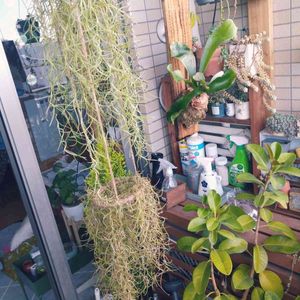 誤って、同じ写真を投稿してしまい、前のを削除しました。フォローしてくださった方、申し訳ありません。🙇♀️ 吊るさげタイプの苔玉ビカクシダ🍃とティランジア🌿 どこに飾るか迷い、部屋のカ-テン越しに✨ たまに、移動し、台所の棚の棒に吊したりしてます。 GSの皆さまの写真を拝見し、観葉植物の飾り方、学ばせていただいています。