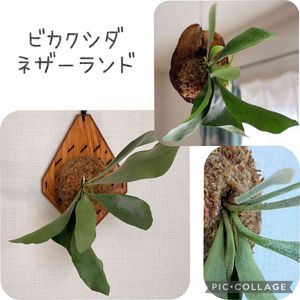 ビカクシダネザーランドです。 『暮らしの図鑑・グリーン』という本でビカクシダを知り、1月にHCでココナッツについた状態で購入しました。(右上) 水やりの度にココナッツの劣化が激しい💦 梅雨の時期にはココナッツがカビるんじゃないかと不安になり…4月初め板付けしました。 また、購入した時に小さな貯水葉がついていたのですが、別の成長点のものだったようで板付けの際に根っこもない状態(成長点と貯水葉だけ)でぽろっと取れてしまいました😱 貯水葉が無く、成長点を上にしたつもりなのですが…未だによくわからず😅 今のところ成長はしているようなので気長に見守ります☺️