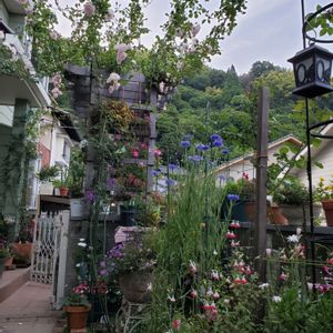 東南から見た、小さな我が家のお庭です。 とにかく、狭いお庭に、空間を使って花を一杯、アートしています。 この花たちの、色彩を意識した並べ替え、植え替えがとても楽しいです。 お義母さんの介護のため、妻の精神安定のため、園芸を始めて、三年目に入りましたが、今では自分の精神安定にも、幸せにも繋がっています。