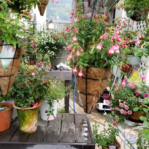 バラの花摘みをしながら、写真を撮っています。手前のラティスにハングしたミニバラ、フクシアなどが元気に育っています。 その向こうには、いつもの「天空のバラの五線譜」ニュー・ドーンや、その他色々な花*花があります。