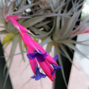 チランジア・アエラントスの花 咲きました💗💜✨ 義実家の庭からチランジアの塊をもらってきたので、分けてお隣のコンドミニアム2階の奥さんに3個おすそ分け。隣のベランダの兄弟もお花が開いてる〜🥰