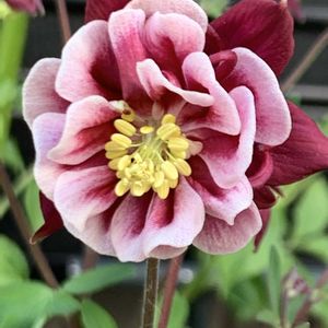 今日のお花の💜オダマキ💜 「西洋オダマキ ウィンキーダブルレッドホワイト」で、シックな色合いと八重咲きの美しい花姿に一目惚れしてしまいお迎えしました🤩💗