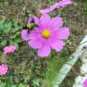 濃いピンクのコスモスを眺めていたら、 ハチドリさんみたいな、可愛い子がお食事に。 ヒメクロホウジャクさんというお名前を 教えてもらいました。