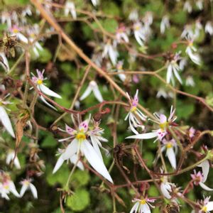 5月24日 今日のお花『ユキノシタ』です。 【ユキノシタ(雪の下)】 東アジア原産、ユキノシタ科の多年草 本州〜九州の山間の半日陰で少し湿った環境に自生し、楚々とした白い花を咲かせる。 5枚の花弁のうち上に3枚ある小さな花弁には、赤紫色の斑点が入るのが特徴。 雪が積もっていても、その下に緑の葉を付ける生命力から名付けられた。 草丈:5~20cm 花期:5~7月 花色:ピンク、白 北九州市中央公園にて