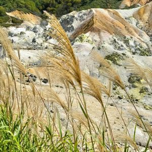 登別地獄谷の荒涼とした地形をバックにススキが風に揺れていました。 何となく似合う風景です☺️