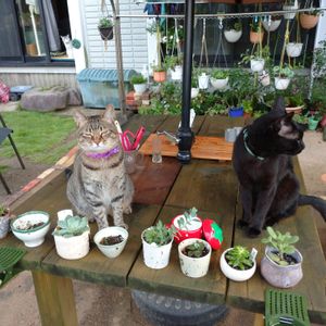 こちらは雨に打たれてビシャビシャになった多肉さん🌱とお外にやっと出れたにゃんず😸✨🎵