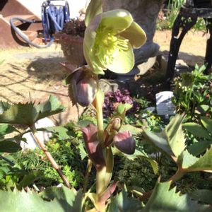 ✨🥀クリスマスローズ🥀✨ 風が冷たいですがお天気で、嬉しいです。 昨年購入したカラーリーフのクリスマスローズです。 [ステルニースモーキーシルバー] 丸弁のお花でグリーン又は少しあずき色がかった花弁が可愛い💕です。 葉の色や形がユニークです。 やっと開花しました。