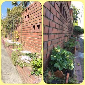 🧱🧱花壇のお花🧱🧱 南側の花壇と北側の花壇です。 同じ時間帯のpicですが、こんなに違いが。 もう間も無く南側のモッコウバラの蕾が膨らむかなぁ〜〜