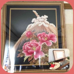🌸和に移行パート2🌸 主人が納戸からこんな額を出してきました。 この額は私が若かりし頃刺繍した物です。 雪囲いをした牡丹ですね。 よくこんな大作を刺繍したもんダァ〜〜。 下の額は和歌が書いてありますが、チンプンカンプンです。 取り敢えず、和に移行ですね。