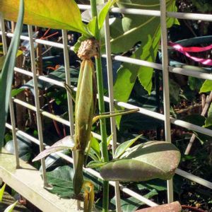 🧐?カマキリ、産卵。?🧐 良いお天気ですね。 庭掃除🧹🧹をしていたら、こんな状態のカマキリを見つけてしまいました。 産卵中〜かしら?
