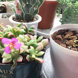💕✨グラコマ バリエガーター✨💕 寄せ植えで使ってるグレコマ。 葉っぱが可愛いピンク色になってます。 お花が咲いてるみたいですね。 丈夫で良く成長します。 育てやすい植物ですね。 まだ、お花は見てません。