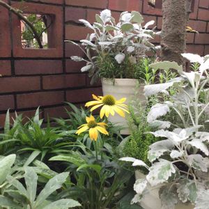💕✨庭の一角✨💕 アラカシの近くの我が家の庭の風景。 エキナセアが庭を明るくしてます✨✨。 後方のルエリア、植え替えたせいか花芽がありませ〜〜ん。
