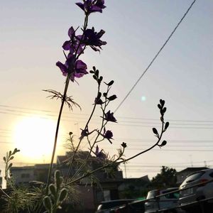 Elmarくんと朝散歩途中(*≧∀≦*) アスファルトの割れ目から元気に咲いてます(╹◡╹)花の名前は分かりません😥 ちょっとシルエットで、見る人は👀余計に分かんないよねー?