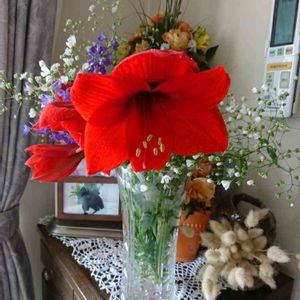 今日は⚛️🌺✨❕❕ 残念なことにアマリリスの蕾、もうすぐに咲くなと通りすぎたとたんにお尻が引っかかって鉢が落っこちてしまいました。かわいそうなので花瓶に。 良かった。ちゃんと咲いてくれました。 ところでまだお顔が白くなってない若いグーさん見つかるかな‼️