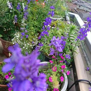 今日は⚛️🌺✨❕❕💕💕💕 これは400pic目 何にしようと迷いましたが私らしくこぼれ種のお花‼️ 毎年この時期に咲いてルーフバルコニーを彩ってくれます。 紫と白の千鳥草‼️💕💕 あちらこちらに花を咲かせてくれるサフィニア自然勾配して、色々な、色も楽しめます。‼️