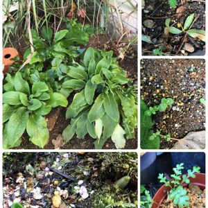 冬が来る前に🌱🌱🌱 少しでも大きくなぁ〜れ 左上 こぼれ種のジキタリス 左下 苔を押し上げ芽を出したスノードロップ 右上 こぼれ種の千鳥草 右中 ばら撒き種の金魚草 右下 こぼれ種のネモフィラ