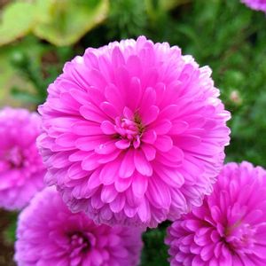 アスター🌈(八重咲き宿根ビクトリア) 八重咲き、一輪目はピンク色でした! 小さなお花ですが、アップで観て下さいね🌸