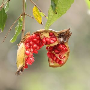 🔴ザクロ(柘榴) 栄養価が高く甘酸っぱいつぶつぶの果実をそのまま食べます。鬼子母神が人の代わりに食べたので、人肉の味がするという迷信があります。 ⚫︎ミソハギ科 ザクロ属 ⚫︎原産 トルコ ⚫︎花期 6月 ⚫︎果期 9月〜10月