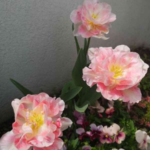 アンジェリケのピンクが濃くてかわいいです。サンネも濃いピンク。もう蕾は無いのでチューリップもあと少しかな。