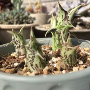 オルベア バリエガータ Orbea Variegata ・置き場所…明るい日陰、夏の直射光は葉が痛む。 ・水やり…乾かし気味に管理、土が乾いてから5~7日後に与える 生育適温… 20~30℃ 耐寒性…5℃ ガガイモ科のキモカワ🌼が咲くこの子 やっと出逢えて連れ帰りました ( *´艸`)