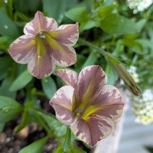サフィニアアート とらネコ 咲きました😺 9センチポットの小さい苗だけど、大きくなって欲しい。クリーム色のこぼれ種っ子のスイートアリッサムと、ユーフォルビア ピンクフロストと寄せ植えにしています。