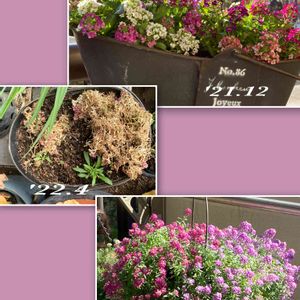今日も良い天気でした☀️ 今年はスィートアリッサムの鉢が5鉢 今モリモリになっています。 先日投稿した白系のアリッサムの生育の過程を写真て記録していなかったのですが、こちら紫系のは何枚か撮っていましたので変化をご覧いただけたら嬉しいです〜(=´∀`) ・昨年12月に植え付け。紫色や白色などミックスのアリッサムでした。 ・今年4月には枯れ枯れに〜💦 でも緑色の葉っぱがあったので枯れた所を取ってそのままに。 ・夏の暑い頃は葉っぱだけ少しずつ増えてきてたように思います。 ・10月には2色復活)^o^( 午前中日がよく当たる場所に置いて、土が乾いたら水をたっぷり。 約10日毎の液肥をあげています。 日があまり当たらない所に置いていたのは枯れて復活ならず。 他の花との寄せ植えのはあまり元気無いかも。 *アリッサムだけよく日が当たる所に置いて基本的な水やり、液肥やりをしてのんびり見守るのが良いのかも( ◠‿◠ ) ベランダであまり雨は当たらないかもしれません。 テキトーなのでもっといい育て方があるのかも! 少しでも参考になれば良いのですが(〃ω〃)
