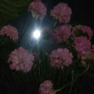 こんばんは😃🌃 今日も一日お疲れ様でした<(_ _*)> 今夜はピンクムーン🌕だとか((*゚∀゚*))) 満月にはなってないようですが(^-^; ベランダ真ん丸 アルメリアピンクボールさんと一緒に📷 追記 ググってみたらピンクムーン🌕は 27日とありました😅😄 前夜ピンクムーン🌕でした😅😄