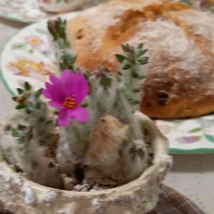 おはようございます☁~☔ 今年カット✂️して植え替えた ウェルデルマニー 今朝 可愛いお花が咲きました GS友さんに教えて頂いた 全粒粉、強力粉のドライフルーツ入りパンを昨日 焼いてみました 見た目と違い柔らかく優しい甘みのパン 教えて頂いた分量の半分で••• この大きさ2つ 1つは焼きたてを頂きました とっても美味しく出来ましたょ!