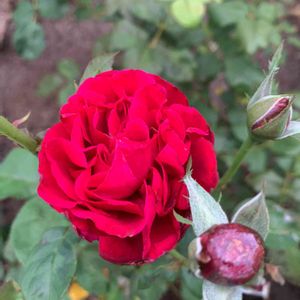 一際目を引く鮮やかな赤い花が咲いてます。調子を戻しつつあるバラです。 右下の蕾は夜のうちにホソオビに半分近く食べられてました。他の新芽も根こそぎ喰らい尽くしてるやつをなんとか見つけてあの世に行っていただきました。毎晩仕事から帰って2時間も見回ってるのに不覚でした。