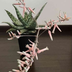 アロエ・ヘミンギーが開花しました 花の重みに耐えきれずに花茎が曲がっちゃいました ソマリエンシス系の緑と白の葉色もお気に入りです