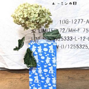 こんにちは☀ 今日はムーミンの日ですね✨皆さんのお写真がとっても可愛くて、毎回見せて頂くのが楽しみです。 昨年ムーミンの食器で参加したので、ムーミンは他には無いな~と思っていたところ、こんな可愛い紙袋がありました💙 植物とどう合わせよう…そうだ!! 瓶のカバーにしよう!! なに生けよう?? アナベルでしょ!! 1人楽しい時間を過ごせました🎶 シンプルなムーミンpicですがよろしくお願いします😊