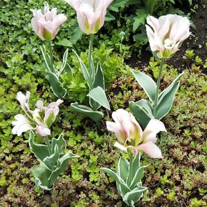 チューリップ チャイナタウン ピンクのグラデーションに グリーンが入った おしゃれさん チラッと見える葉は斑入りです。