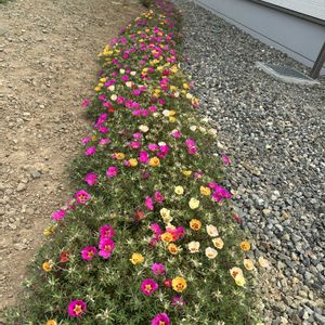 お隣りさんの松葉ボタン、今年は見事です‼️ 写真は途中からです。 全体の長さ15メートルほど有ります。 お隣りさんと、内との間に1メートルほどの人が通れる通路有り、その道沿いに咲いてます。 お互いに通路の草取りをして、松葉ボタンを楽しんでいます♪