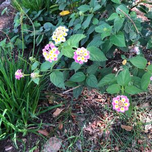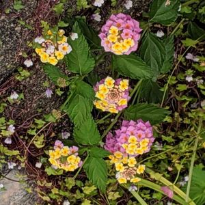 花畑のお隣の庭には、地植えのランタナさん満開です 可愛いお花がたくさん咲いています❣️ 別名 七変化 紅黄花 2色の花びらが不思議です 花言葉は、家庭の調和