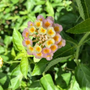 ランタナ 花数が少なくなっています。小さな花が手鞠状にまとまって花火のように咲く花は愛らしいです。