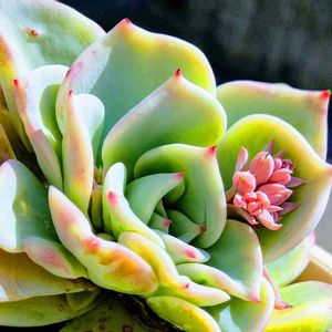 おはようございます☀。 真ん中からお花が🤣。 Echeveria chihuahuaensis🍀。 ググってみると、チワワエンシスは、桃太郎のお母さん(そうなの?)で桃太郎より葉っぱが短く小ぶり、成長が遅い、らしい😳。