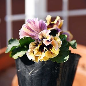 朝日を受けるパンジービオラ カワイイ😊 今年は暖かいのでもう沢山咲いてます。