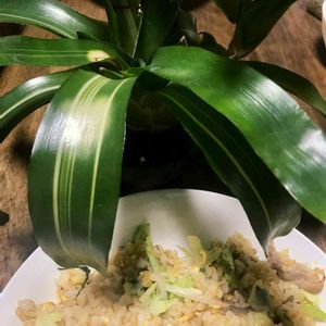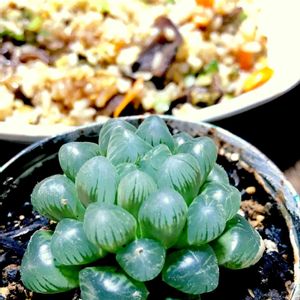 多肉炒飯コラボ キクラゲと回鍋肉の残肉の炒飯と、オブツ。 キクラゲ炒飯は、キクラゲを大ぶりに刻むと、歯応えあった旨し。 オブツは、全く成長しないが、ジュレ無いだけマシってもんだろうな。